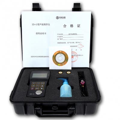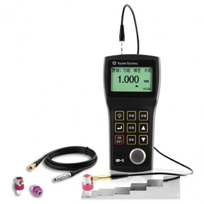 單晶延遲線探頭的手持式精密超聲波測厚儀UD-3,采用單晶延遲探頭,利用多次回波提高精度,使分辨率可達0.001mm,測量下限達0.30mm 。UD-3具有普通和精密兩種工作模式。普通模式采用界面波-回波法,測量范圍是 1.5mm~20mm ;精密模式采用回波-回波法,測量范圍是 0.30mm~10mm。